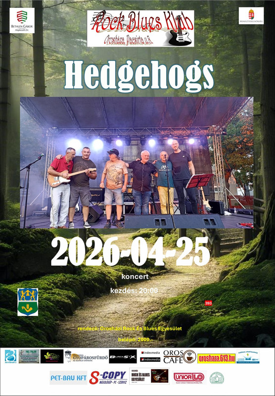 2026. 04. 25. 20.00 óra Rock Blues Klub Orosháza - Orosháza, Pacsirta u. 8. (Tel.:30/471-2107) Hedgehogs koncert (classic rock) A műsorváltoztatás jogát fenntartjuk!